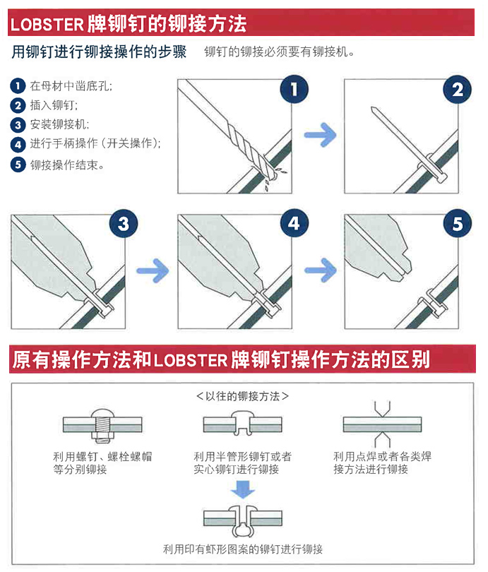 LOBSTER蝦牌鉚釘槍可應用于各種裝配工序中,由于可以從單側將多個母材一次性加以緊固,因此可以節(jié)省勞力,降低成本,提高作業(yè)速度,從而提高生產(chǎn)的合理性。